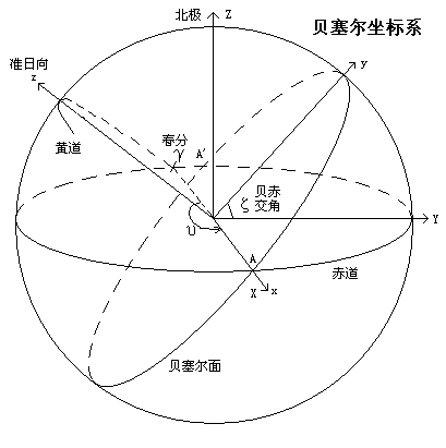 第九章 日食原理 一、月影轴、本影、伪本影、半影、日食类型 月亮遮住了太阳光,使地球在的人们看不见太阳或只看到太阳的一部分,便形成了日食。在任意时刻,月亮的影子总在存在的,当地球进入月亮影子区域,才能看到日食现象。 ![]() 当角度满足一定条件时才能发生日食。即月亮应在地球和太阳之间才可能发生日食。即日月合朔时刻(或此刻附近)才可能发生日食。如果日月合朔时,月亮位置太“高”或太“低”,影子落在地球的上方(北极之上)或下方(南极之下),地球上看不到日食。 当距离满足一定条件时才能发生全食。设地球的赤道半径为1,那么月亮的影子长度约为58.57。地球带着月球围绕着遥远的太阳公转,公转的轨道是个椭圆,所以月亮月有时离太阳近此,有时候远一些,所以影子长度约为58.57±1.67%,这个值与地月距离60.34很接近。月球绕地运动轨道是个偏心率较大的椭圆,地月距60.34±5.5%,因此地月距离可能小于影子长度,形成日食。 二、日食的周期性 三、空间直线与地球的交点 地球的形状可近似为旋转椭球,月影轴或月影锥的母线可以使用一条直线来描述。某时刻月影轴与地球的交点就是该时刻日食的中心点。影锥的各条母线与地球的交点构成影子在地球上的轮廓线。 ![]() 利用直线的参数方程求解比较容易 ![]() 以下示例程序计算直线与地球的交点,直线经过(x1,y1,z1)和(x2,y2,z2)两点,e为极赤径比,r为赤半径: 交点坐标(x,y,z)求出后,交点的经度α = atan2(y,x),地理经度 L = α - g,地心纬度φ'为tanφ' = z / sqrt(x*x+y*y)。地心纬度φ'与地理纬度φ的关系为:tanφ' = (b/a)2tanφ,式中b/a是极半径比赤道半径。显然地心纬度小于地理纬度,在南北极和赤道上二者相等。 最后,地理经度应限制在-180°到+180°,地理纬度应限制在-90°到90°。西方著作中,地理经度往往是向西为正,那么有L = g - α 四、日食计算所用的坐标系 并没有硬性规定要用哪种类型的坐标系。一般的说,精确的日食计算中,常常用到直角坐标系。 (一)坐标变换 (二)贝塞尔坐标系及其变换 贝塞尔坐标系的定义: z轴经过地心且平行于月影轴,往太阳那个方向为正。垂直于月影轴且经过地心的平面为基面。基面与赤道面的交线为x轴,xyz三轴构成右手坐标系。如果规定x轴正方向的赤经比z轴赤经多90度而不是-90度,这样y轴总是在北半球。 ![]() 设z轴上某一点记坐B向量,写为直角坐标形式记作B[0,1,2],jd时刻太阳赤道坐标为S[0,1,2],月亮赤道坐标为M[0,1,2],存在关系式B = S - M。应注意,这个关系式是一个矢量运算关系。当S、M为球面坐标时,请先将它们转为直角坐标,然后再运算。最后得到的B还可以转为球面坐标。因此,在球面坐标系中,z轴向量的赤道坐标表示:B = xyz2llr( llr2xyz(S) - llr2xyz(M) )。实际上,B的方向十分接近太阳,有中心线日食发生期间,B与S的角度差不到10角秒。 贝塞尔坐标变换三要素: 有了以下三个参数,就可以在贝塞尔坐标、赤道坐标、地理坐标之间进行坐标变换。 当z轴向量B求出后,贝赤交角立即得到:ζ= 90-B[1],同时得到A点的赤经(起算点赤经):υ = 90+B[0]。如果天体赤经要转换为以格林尼治子午圈起算的经度,则应将天体赤经减去格林尼治恒星时。格林尼治恒星时是一个角度量,它指格林尼治子午圈相对春风点的赤经(角度)。 已知天体赤道坐标P[]求其贝塞尔坐标: 已知天体贝塞尔坐标P[]求基赤道坐标: 用直角坐标进行贝、赤坐标变换 ![]() xyz是贝塞尔直角坐标系,XYZ是A点(贝赤交线上)起算的赤道直角坐标系。x轴与X轴重合,y轴向量(0,P,Q),z轴向量(0,-Q,P),其中P = cosζ,Q = sinζ